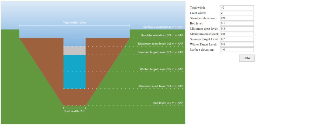 In many projects I work with hydraulic structures. In order to publish the outcomes of my projects I’d like to visualize them dynamically on the web. So here’s an experiment with HTML + Javascript + CSS in generating a weir schematic, based on the weir’s parameters.